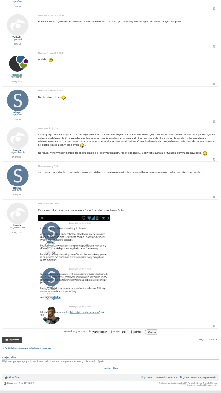 Do pełni szczęścia brakuje jeszcze tylko działającego shoutboxa. O ile dobrze pamiętam, to trzeba z głównego stylu przekopiować pliki mchata do wersji mobilnej. Aktualnie czat się wyświetla, ale wygląda tak: http://img.nostatic.pl/img/screenshot20...9c905e.png i nie można wysłać wiadomości. No i fajnie by było dodać odnośnik w menu.